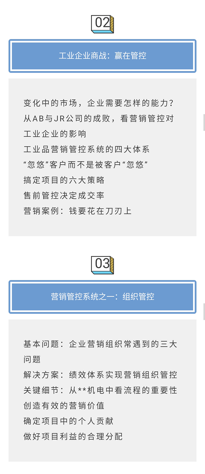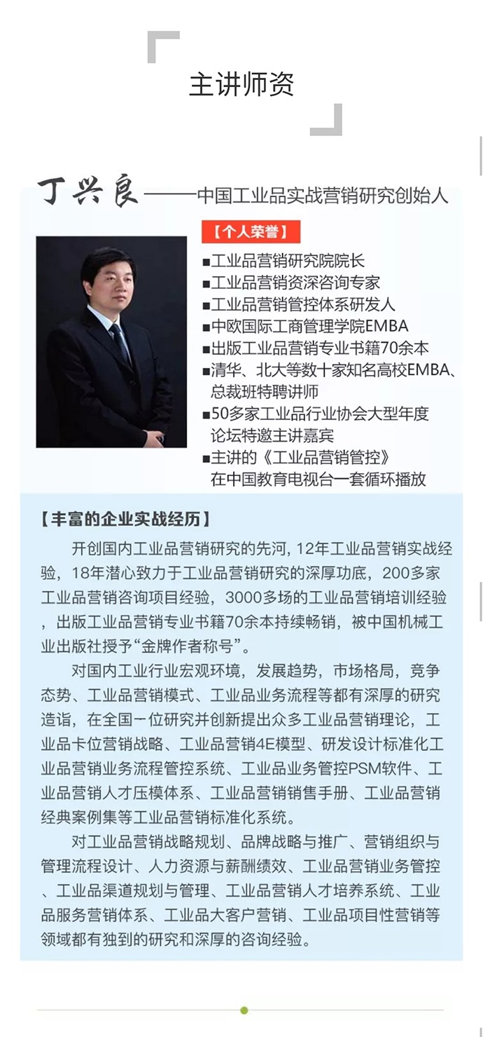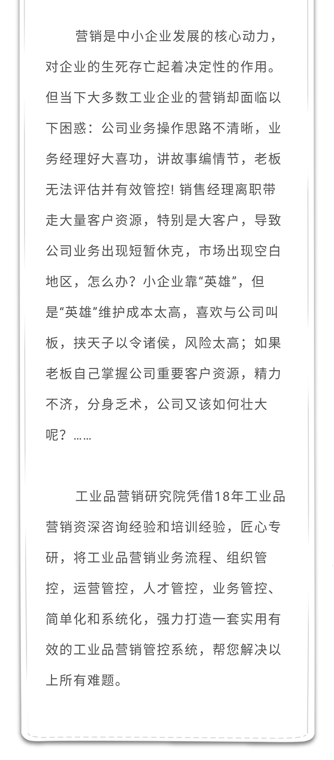 【營銷管控公開課預告】2018年6月22-23日 深度營銷管控系列“工業(yè)品營銷管控”公開課! 點擊次數:5854發(fā)布時間:2018-6-1 17:06:54 上一條:【新產品品牌及推廣開課預告】 6月8-10日 工業(yè)新產品市場規(guī)劃與推廣傳播策略公開課下一條:【總裁班開課預告】8月24-26日 中國工業(yè)品營銷實戰(zhàn)咨詢式輔導總裁班!