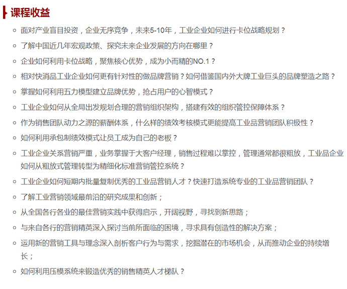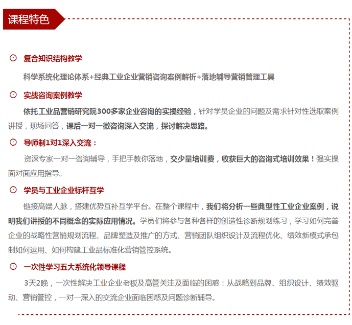 【總裁班開課預(yù)告】8月24-26日 中國工業(yè)品營銷實(shí)戰(zhàn)咨詢式輔導(dǎo)總裁班! 點(diǎn)擊次數(shù):6621發(fā)布時(shí)間:2018-6-5 11:40:31 上一條:【營銷管控公開課預(yù)告】2018年6月22-23日 深度營銷管控系列“工業(yè)品營銷管控”公開課!下一條:【人才壓模開課預(yù)告】7月26-29日 工業(yè)品營銷精英人才壓模系統(tǒng)公開課