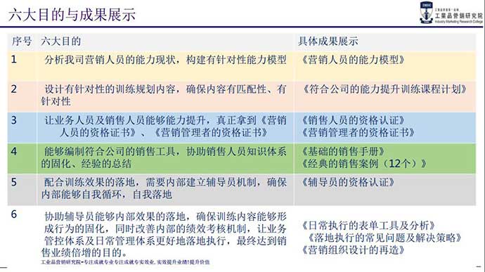 本次培訓,通過全面營銷人員素質(zhì)能力模型的構建和分析,量身定制營銷培訓方案,旨在系統(tǒng)化提升營銷人員的綜合銷售能力,提升營銷人員的職業(yè)化素養(yǎng),規(guī)范工業(yè)品營銷業(yè)務流程及階段里程碑任務,系統(tǒng)化訓練工業(yè)品營銷的技能,咨詢式一對一落地輔導,導入系統(tǒng)規(guī)范化的銷售手冊,全程采用調(diào)研+分析+分層級定制化+分階段系統(tǒng)培訓+案例演練+工具導入+咨詢式落地輔導+銷售手冊導入+跟蹤輔導