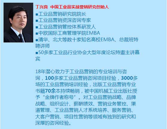 【授課講師】工業(yè)品營銷研究院院長(zhǎng) 丁興良 領(lǐng)銜專家講師團(tuán) 【溫馨提示】:可以報(bào)名單次公開課或者分層級(jí)系統(tǒng)管理,詳情請(qǐng)來電咨詢400-920-6062.