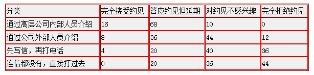 國(guó)外的銷(xiāo)售專家做過(guò)類(lèi)似的調(diào)查,看大部分的公司高層面對(duì)各種不同的商務(wù)約見(jiàn),都會(huì)做什么回復(fù)。