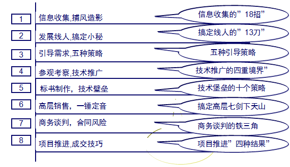 縱向推進是技巧性的,就是不斷重復拜訪、商務活動、技術交流的活動,但針對的對象和目標有可能不同。縱向推進的目的就是完成橫向推進中《任務清單》所規(guī)定的工作內(nèi)容,完成縱向推進的標準就是把項目推進到下一個任務。